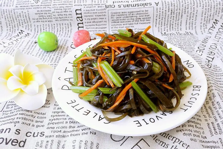 海带、芹菜、胡萝卜、红辣椒、白酒、料酒、蚝油、花椒、盐、白糖、香油、白醋、蒜末、自然鲜酱油
