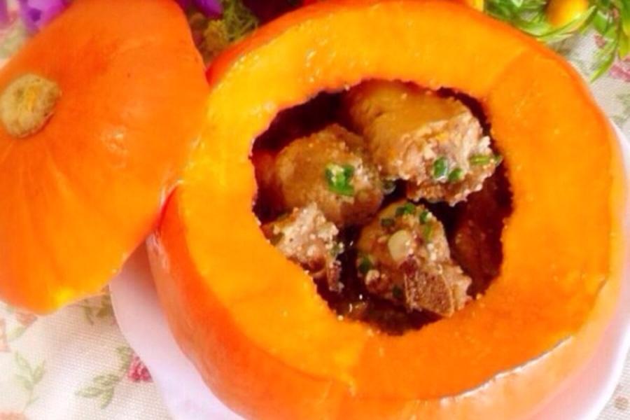 排骨、南瓜、生姜、灯笼椒、豆豉、荷叶、大蒜