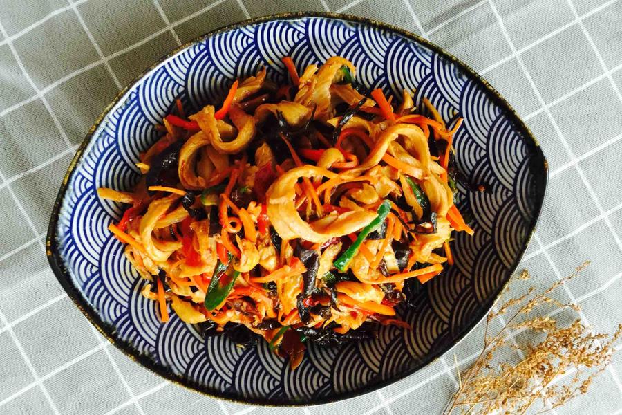 姜丝、青辣椒、面筋、葱、盐、酱油、油