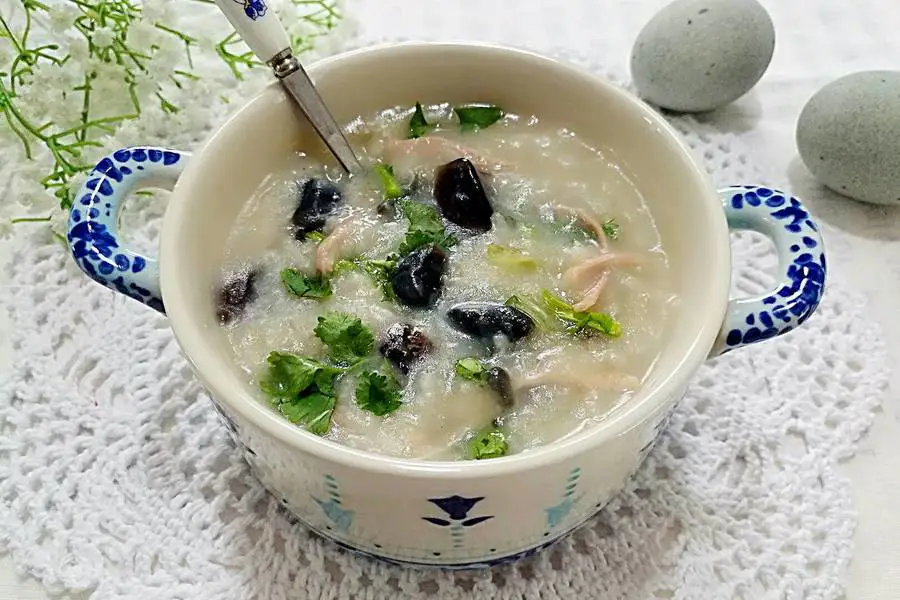 皮蛋、生姜、米、葱花或香菜、里脊肉、盐、胡椒粉、芝麻油