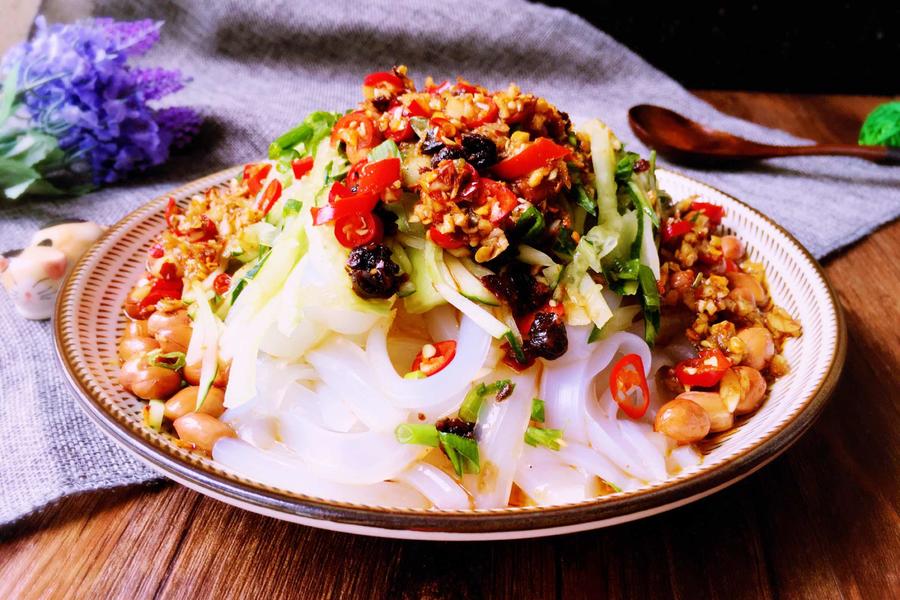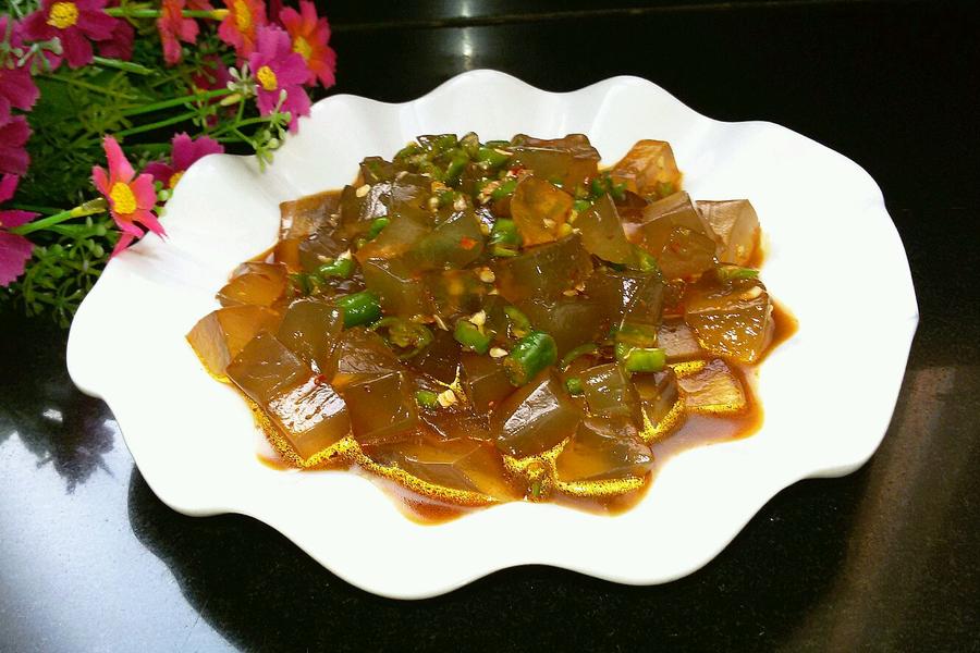 凉粉、醋、辣椒、盐、大蒜、生抽、麻油、蔬汁鲜