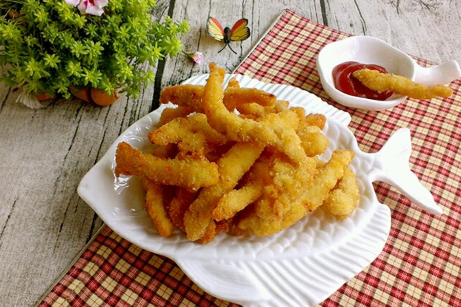 鸡蛋、玉米淀粉、鸡胸肉、料酒、盐、食用油、番茄酱、胡椒粉、面包糠、五香粉