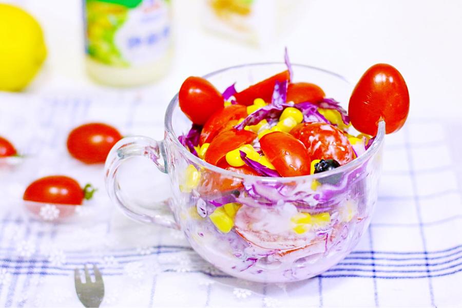 圣女果、紫甘蓝、甜玉米粒、蓝莓、浓稠酸奶、沙拉酱