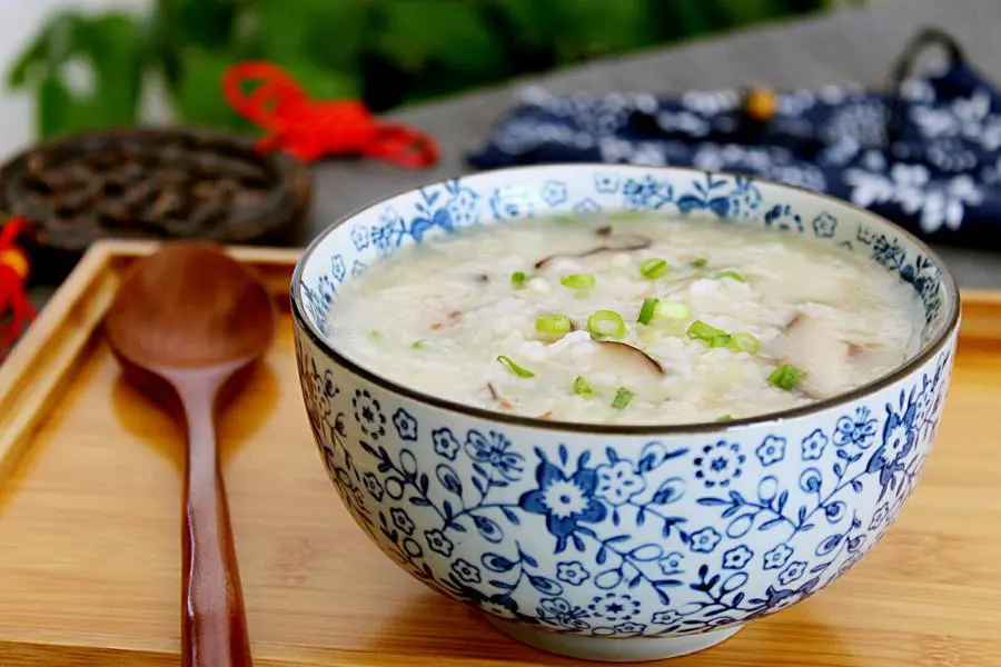 大米、瘦肉、小葱、干香菇、料酒、盐、生抽、清水、香油、淀粉