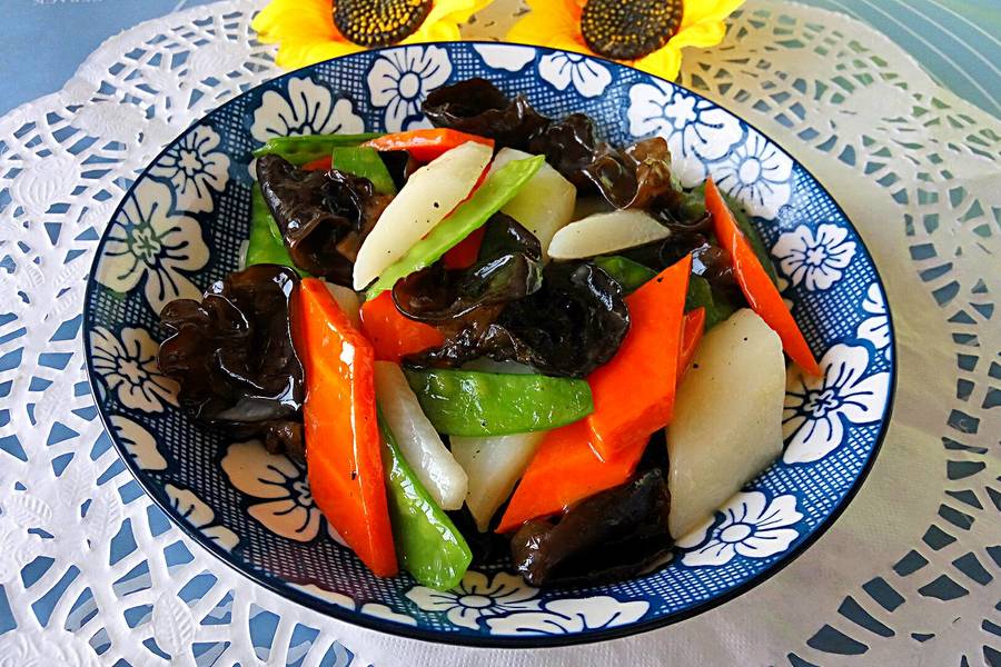 胡萝卜、山药、荷兰豆、黑木耳、蒜片、盐、食用油、姜片、水淀粉、葱段、鲜鸡汁