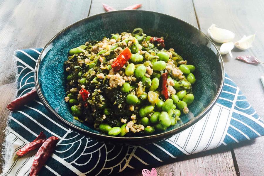 毛豆、水、姜丝、肉丝、辣椒、盐、酱油、油、蒜末