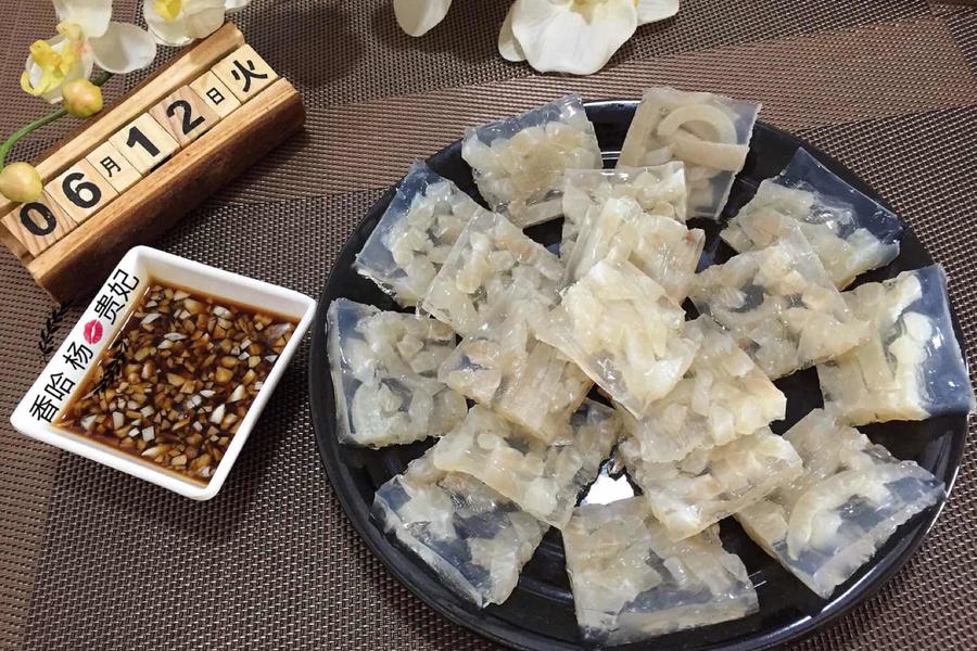 香菜、炸蒜粒、白酒、红指天椒、白砂糖、生抽、食盐、麻油、陈醋、鲜猪皮