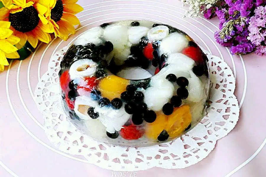 水、吉利丁粉、苹果汁、白砂糖、各种各样的水果