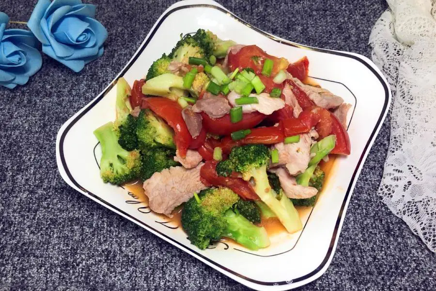 西兰花、番茄、葱花、蒜头、肉片、料酒、生粉、调和油、精盐