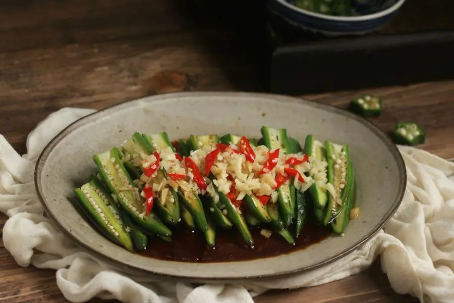 温水、秋葵、朝天椒、冰块、醋、蒜、盐、糖、生抽、油、香油、蒸鱼豉油