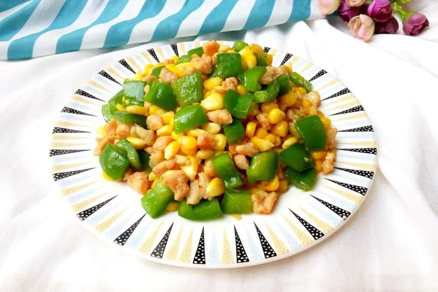 猪肉、玉米粒、红辣椒、姜、小葱、料酒、盐、食用油、生抽、鸡精