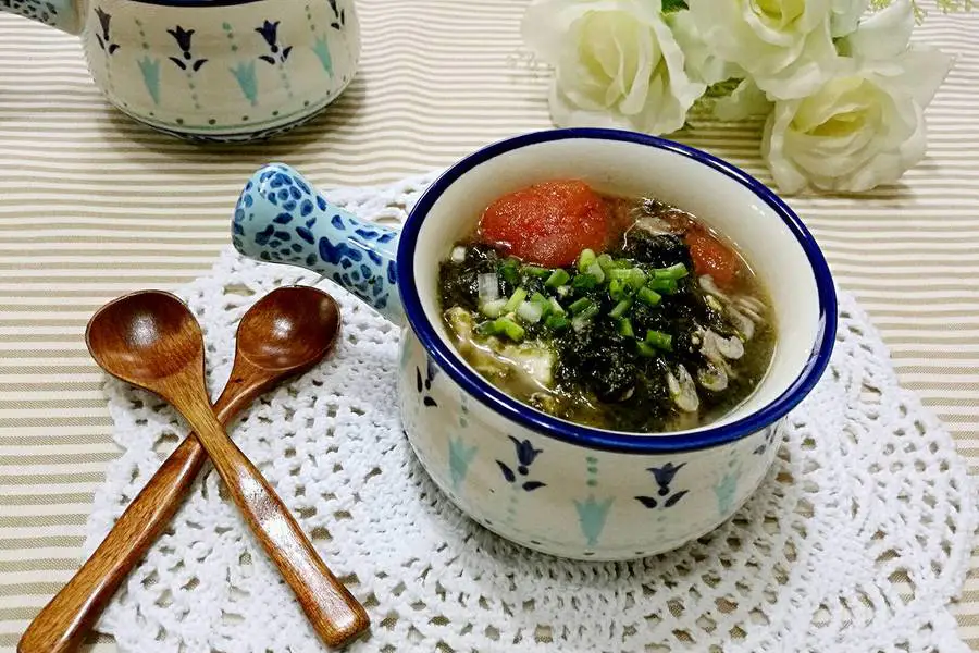 鸡蛋、紫菜、西红柿、虾皮、鸡汤、葱、盐、鸡精