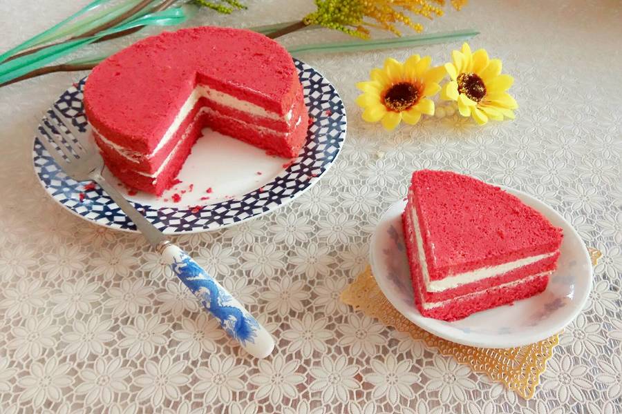 鸡蛋、牛奶、低筋面粉、黄油、可可粉、白砂糖、柠檬汁、红曲粉