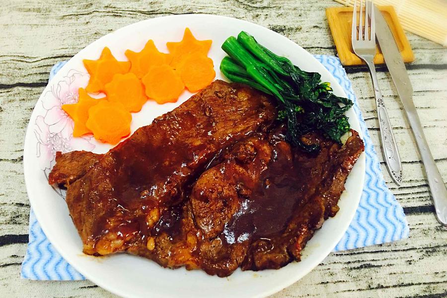 牛排、胡萝卜、西兰花、黄瓜、红酒、红酒、黄油、腌肉料:、黑胡椒、黑椒酱