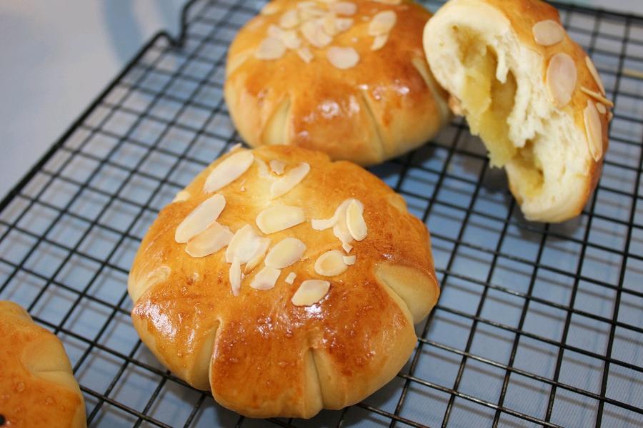 鸡蛋、酵母、高筋面粉、黄油、盐、糖、绿豆沙馅、绿豆豆浆、低筋面粉(撒表面)
