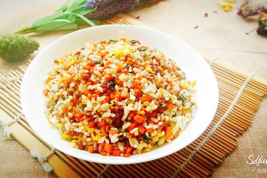 鸡蛋、胡萝卜、黄瓜、米饭、肉沫、葱姜沫、豌豆粒