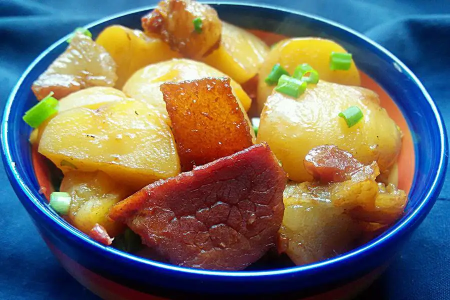腊肉、土豆、姜、蒜、花椒、酱油、香醋