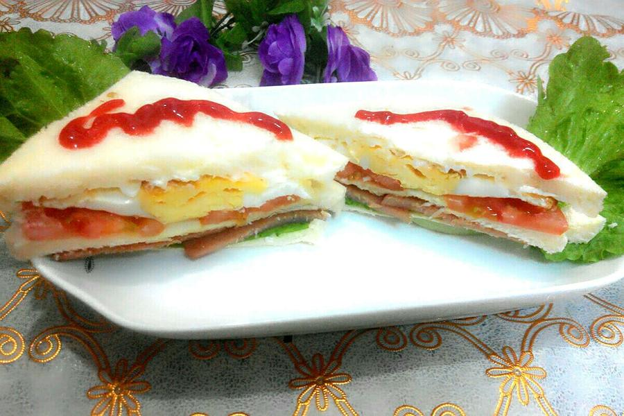 鸡蛋、生菜、番茄、面包片、午餐肉(大的火腿肠)