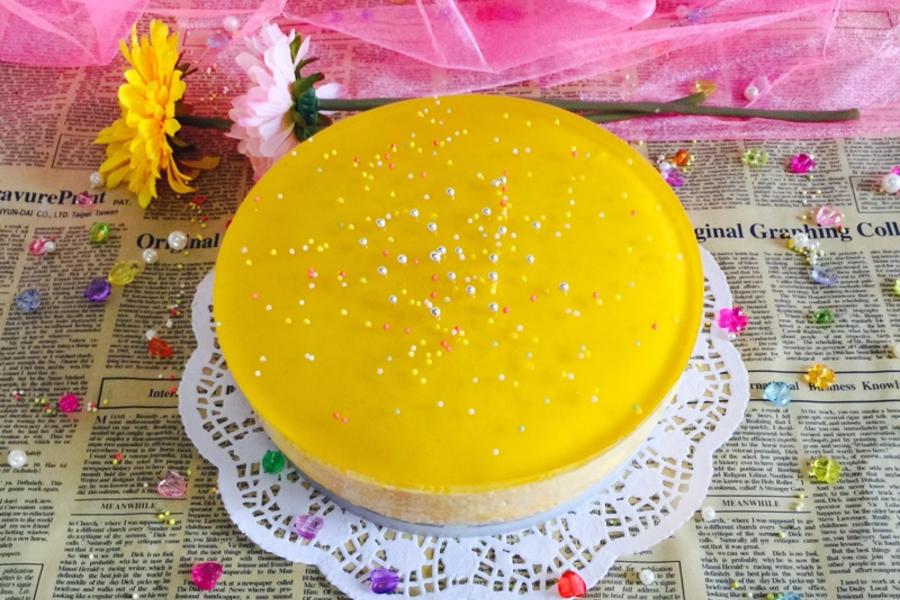芒果、牛奶、细砂糖、细砂糖、凉开水、八寸戚风蛋糕、鱼胶粉、淡奶油、镜面:、橙子味QQ糖