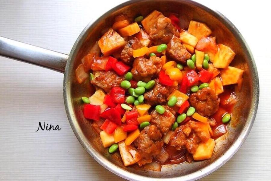 排骨、鸡蛋、洋葱、菠萝、毛豆、白芝麻、红薯淀粉、彩椒、米醋、酱油、色拉油、番茄酱、胡椒粉、姜片、米酒、蒜末、五香粉、冰糖或白糖