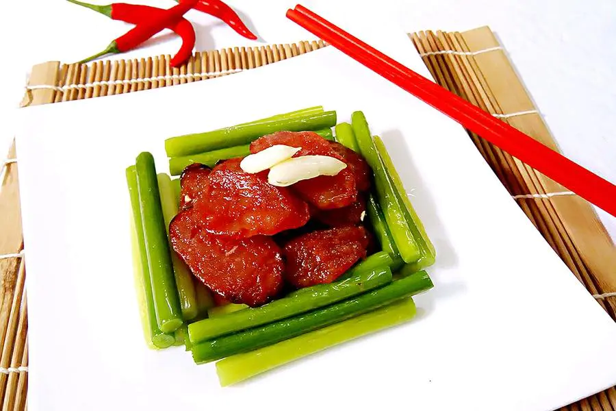 香肠、青辣椒、红辣椒、葱、姜、蒜、李锦记天成一味酱油、食用油、鸡精、白糖、李锦记蒜蓉辣椒酱