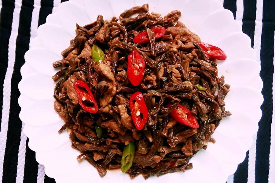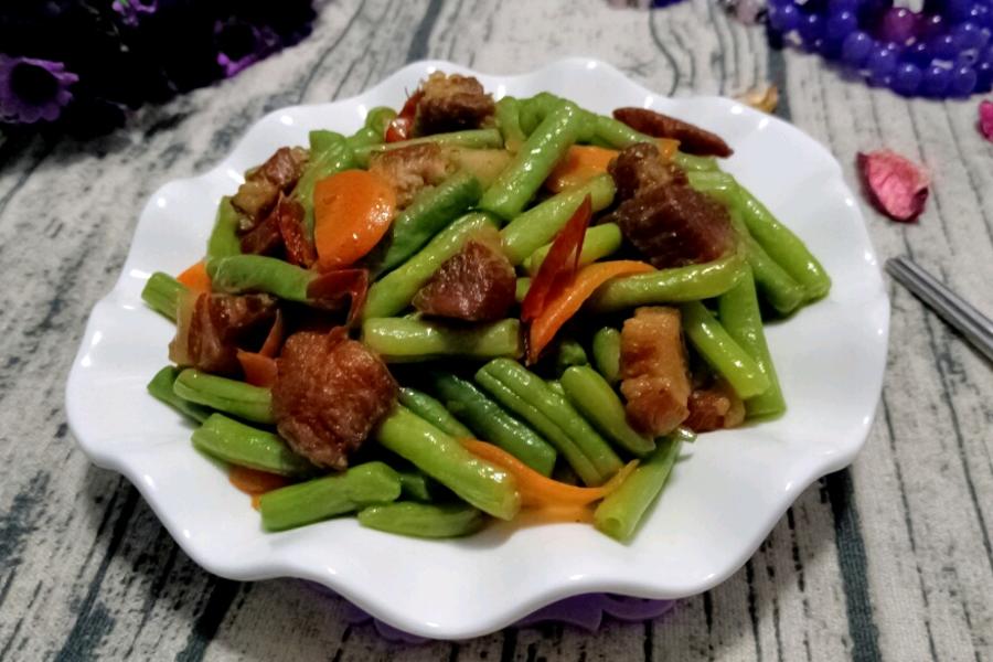 胡萝卜、豆角、干红椒、盐、食用油、生抽、香油、味精、水淀粉、十三香、熟猪炖肉