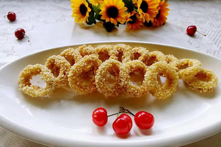 鸡蛋、玉米淀粉、面包屑、鱿鱼圈、料酒、盐、黑胡椒碎