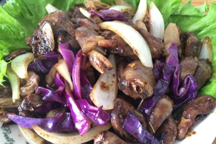 紫甘蓝、圆葱、鸡心、盐、辣椒粉、孜然粉、韩式烧烤酱