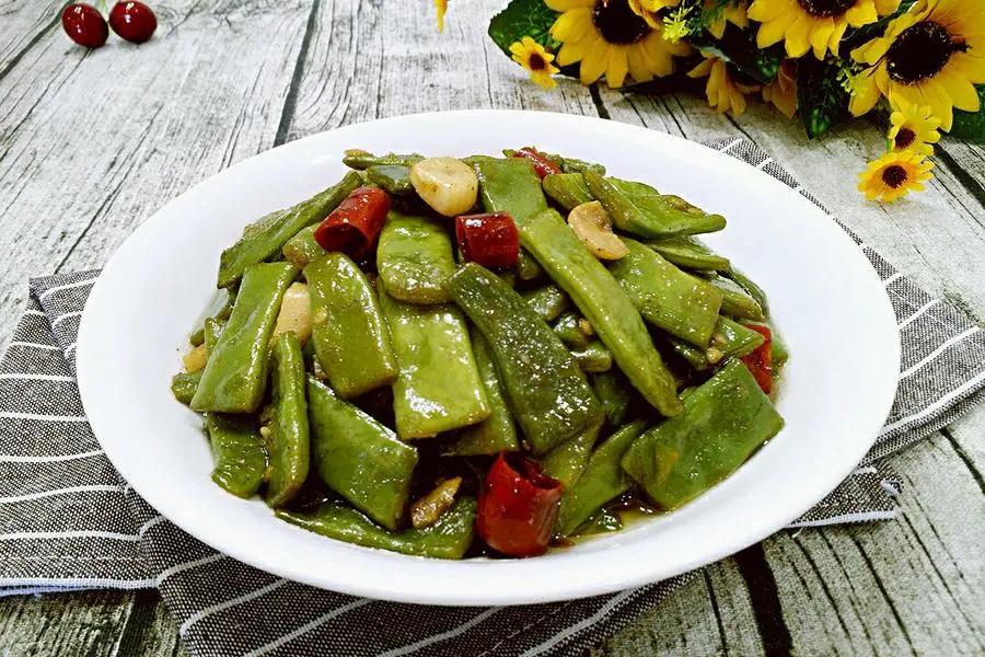 蒜片、猪肉未、葱、干辣椒、四季豆、豆瓣酱、姜片