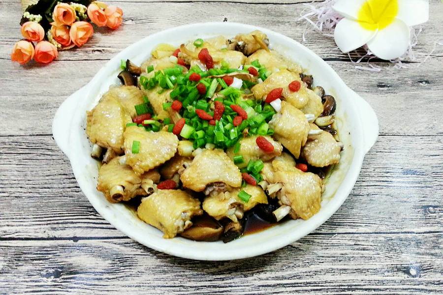 鸡翅、枸杞、香菇干、蒜、小葱、姜片