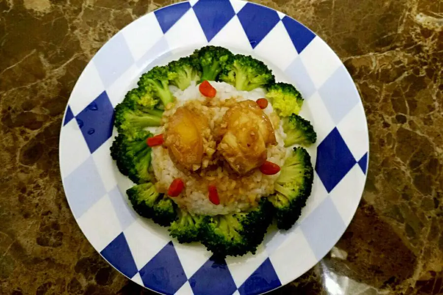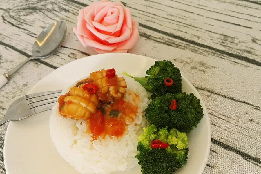 西兰花、米饭、烧汁鲍鱼罐头/佛跳墙罐头
