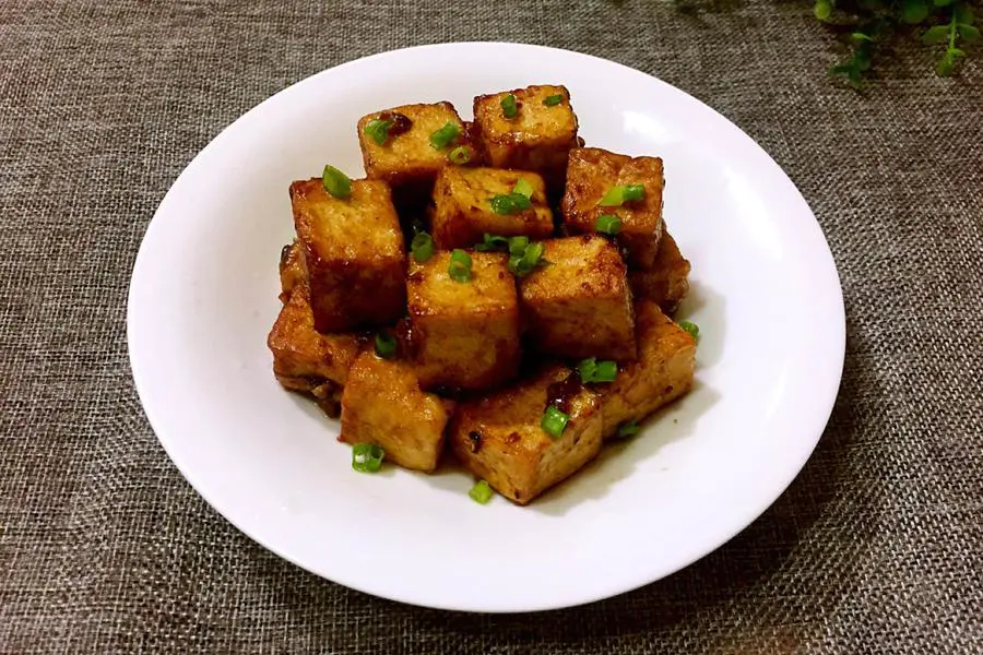块豆腐、盐,鸡精、糖、李锦记黄豆酱、青、红椒切粒、葱末、蒜片