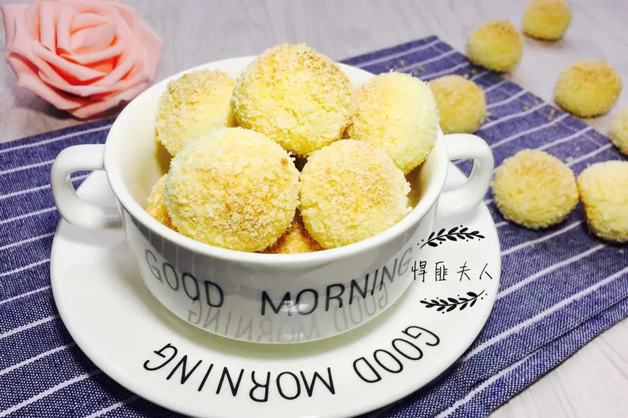 低筋面粉、蛋白、奶粉、椰蓉、细沙糖、椰蓉(蘸表面)