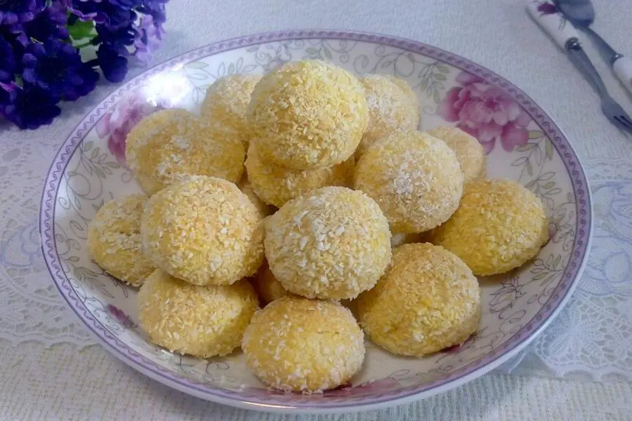 牛奶、低筋面粉、蛋黄、奶粉、黄油、椰蓉、糖粉、椰蓉(裹表面)