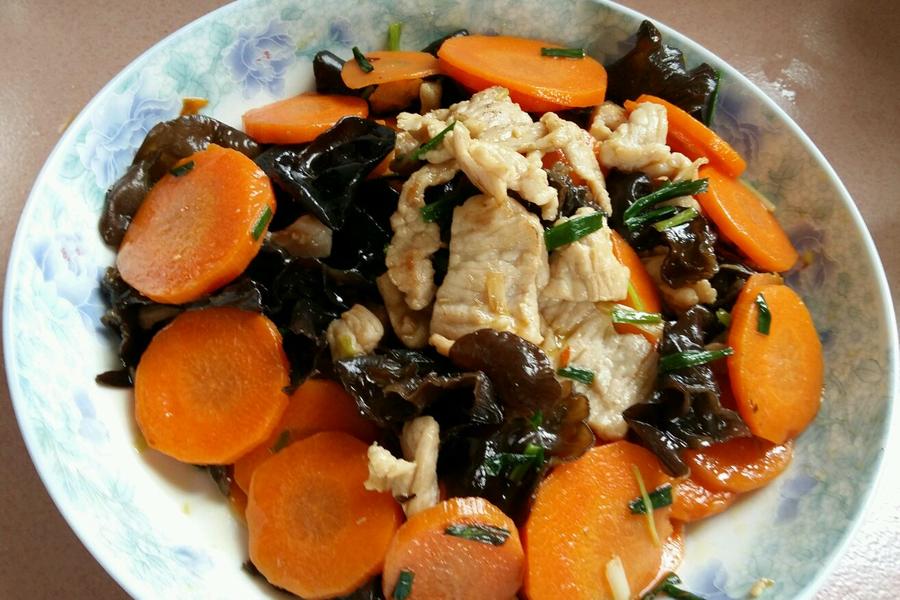 胡萝卜、精瘦肉、木耳、姜、盐、大蒜、白糖、花生油、淀粉、十三香、味极鲜