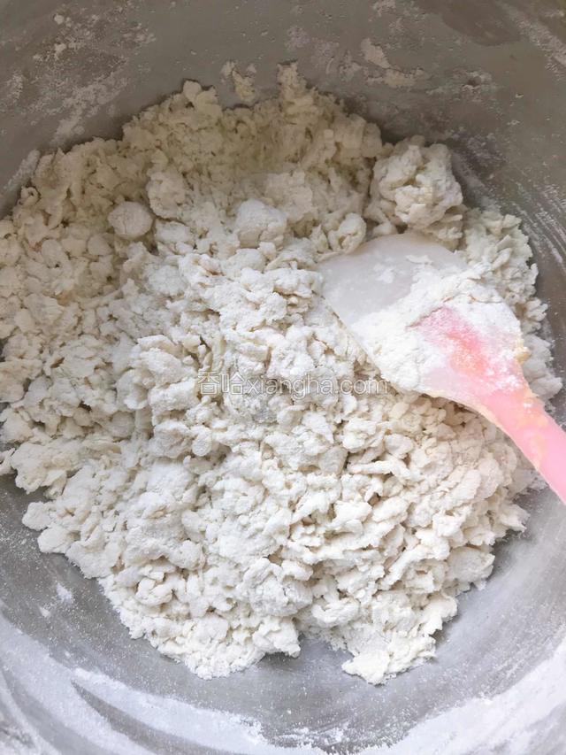 2.牛奶稍温,加入发酵粉化开,倒入面粉,小苏打,盐搅拌均匀