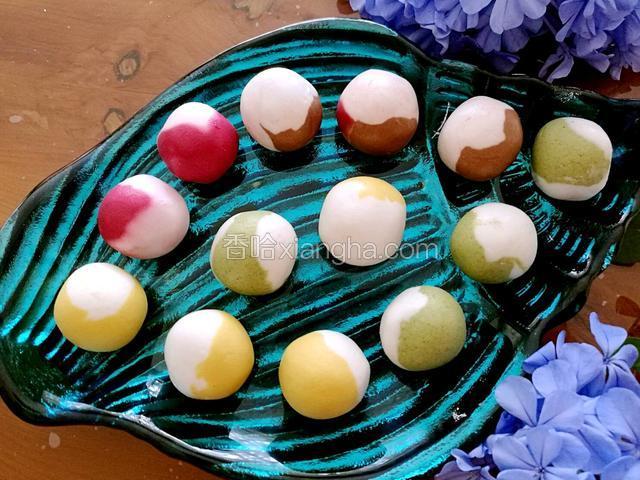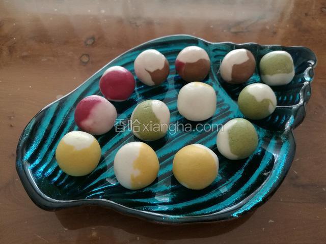 1.用稍烫的水把糯米粉和成不沾手的面团,然后取出自己想要大小的4种面团,分别放上果蔬粉,和成带颜色的面团,颜色深浅看个人喜好,感觉面团干稍微放点水。然后用保鲜膜覆盖。