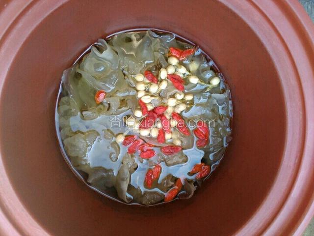 5.将银耳放入炖锅中,加适量水大火烧开转小火慢炖一个半小时。