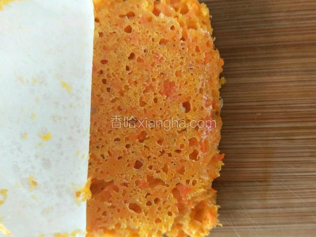 5.菠菜泥中加入适量面粉,搅拌至粘稠且不易滑落的状态,并盖上保鲜膜。类似于把面和的稀稀的,用筷子能挑起来但不容易滑落下来的状态!胡萝卜同理。然后锅中加入50-60度的水,发酵至2倍大的时候上蒸锅,盖上盖子,大火蒸20分钟。焖2分钟。注意:最好在容器底部放层油纸!好脱模哦!