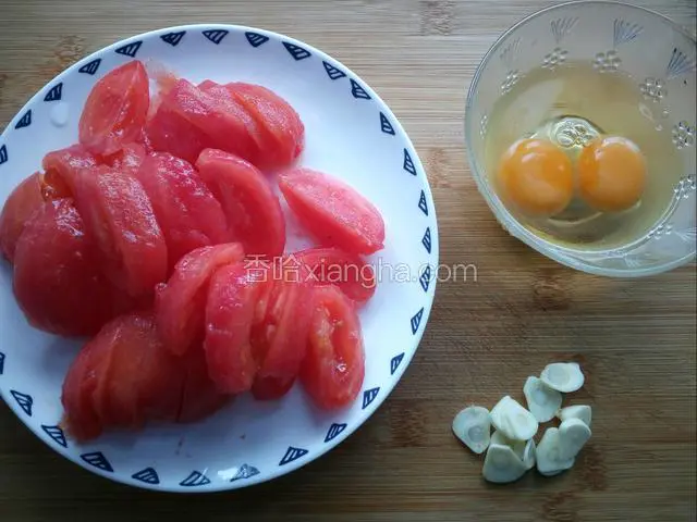 6.西红柿切块,蒜切片,碗中打入两个鸡蛋。