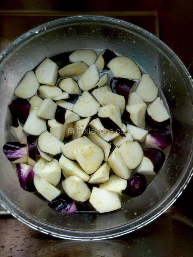 2.茄子清洗干净切滚刀状,放到水里面泡一下,防止发黑。