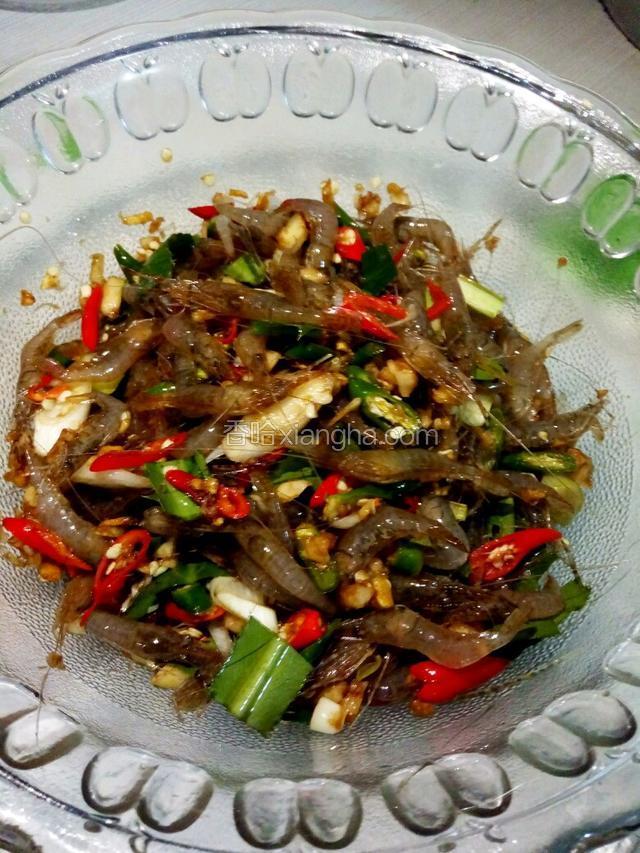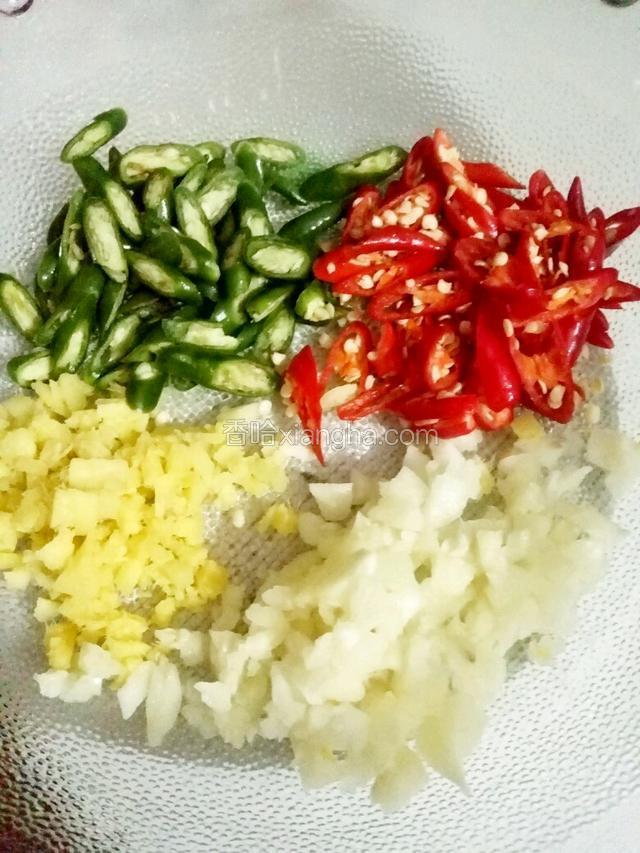 4.姜蒜剁碎,小米辣,小青椒斜刀切小片,一起放碗底备用