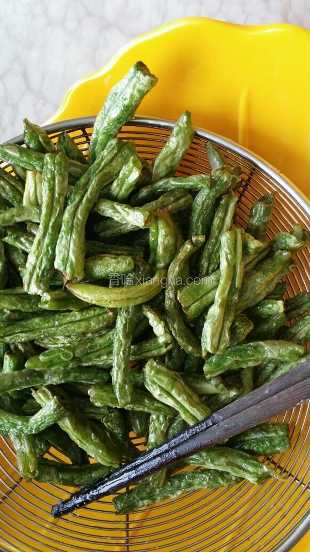 4.豆角控干水,入八成热的油锅炸熟。全部炸完后,油重新烧热,炸过的豆角全部倒进锅里最后炸一次。