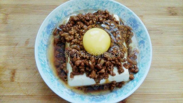 4.将肉末均匀的放在豆腐上