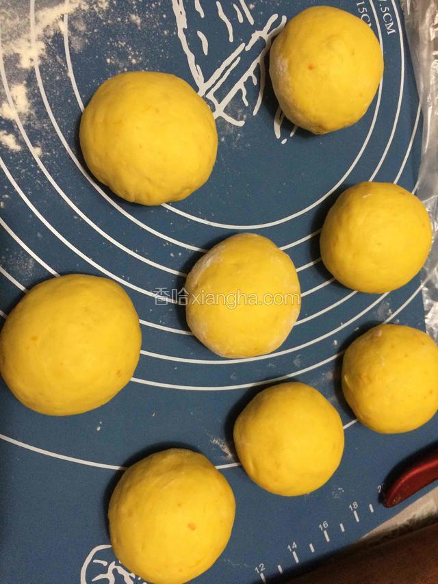 4.三色面团分成大小相同的小面团,简单揉成球备用;