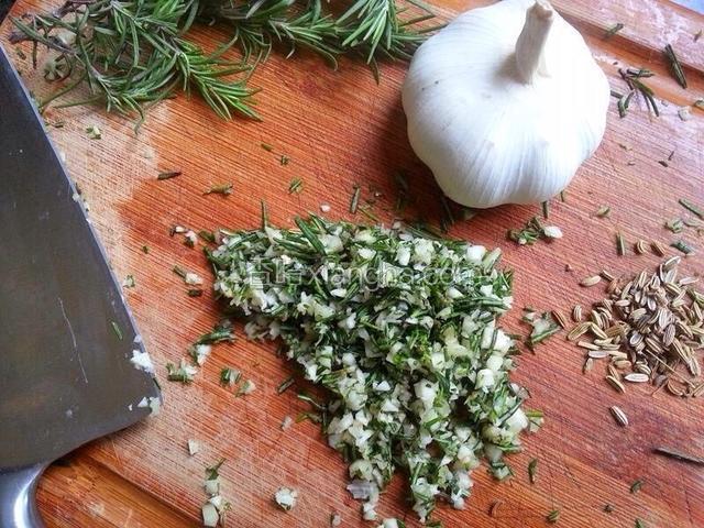 2.把迷迭香叶子,大蒜切碎,香菜籽稍烤香碾碎。