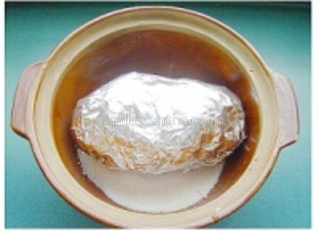 6.锡纸向上包好。另取一张锡纸覆盖在表面,也包好。
