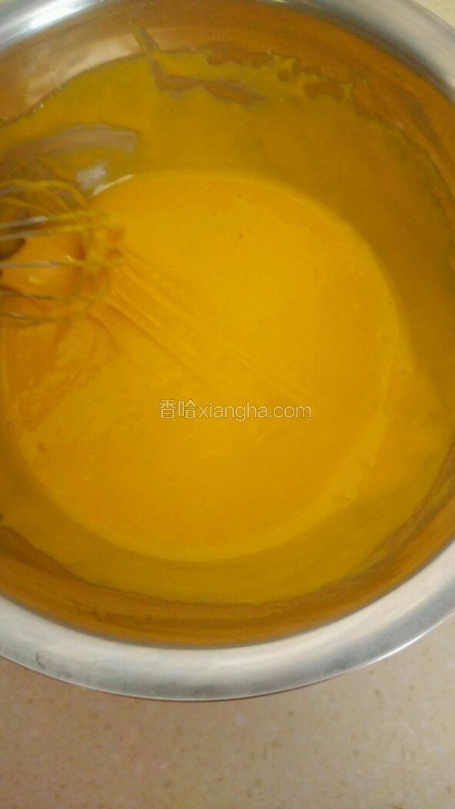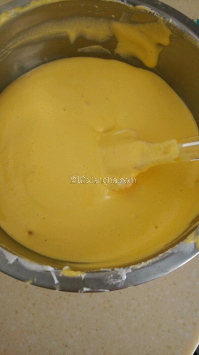 5.筛入低粉,用不规则无规律搅拌法搅拌蛋黄糊。搅拌好的蛋黄糊划过有痕。
