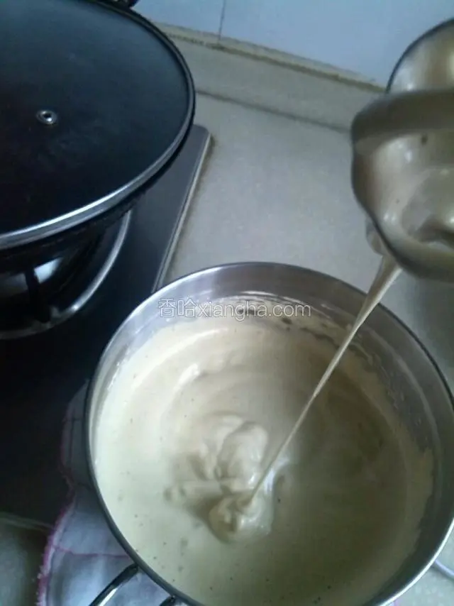 3.用打蛋器高速将全蛋液打发至稠度变弄,低落的蛋湖在表面上不消失就可以了