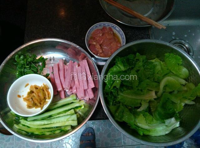 1.将青瓜洗净对半切条,生菜洗净剥开,午餐肉切条,猪扒切片放置准备